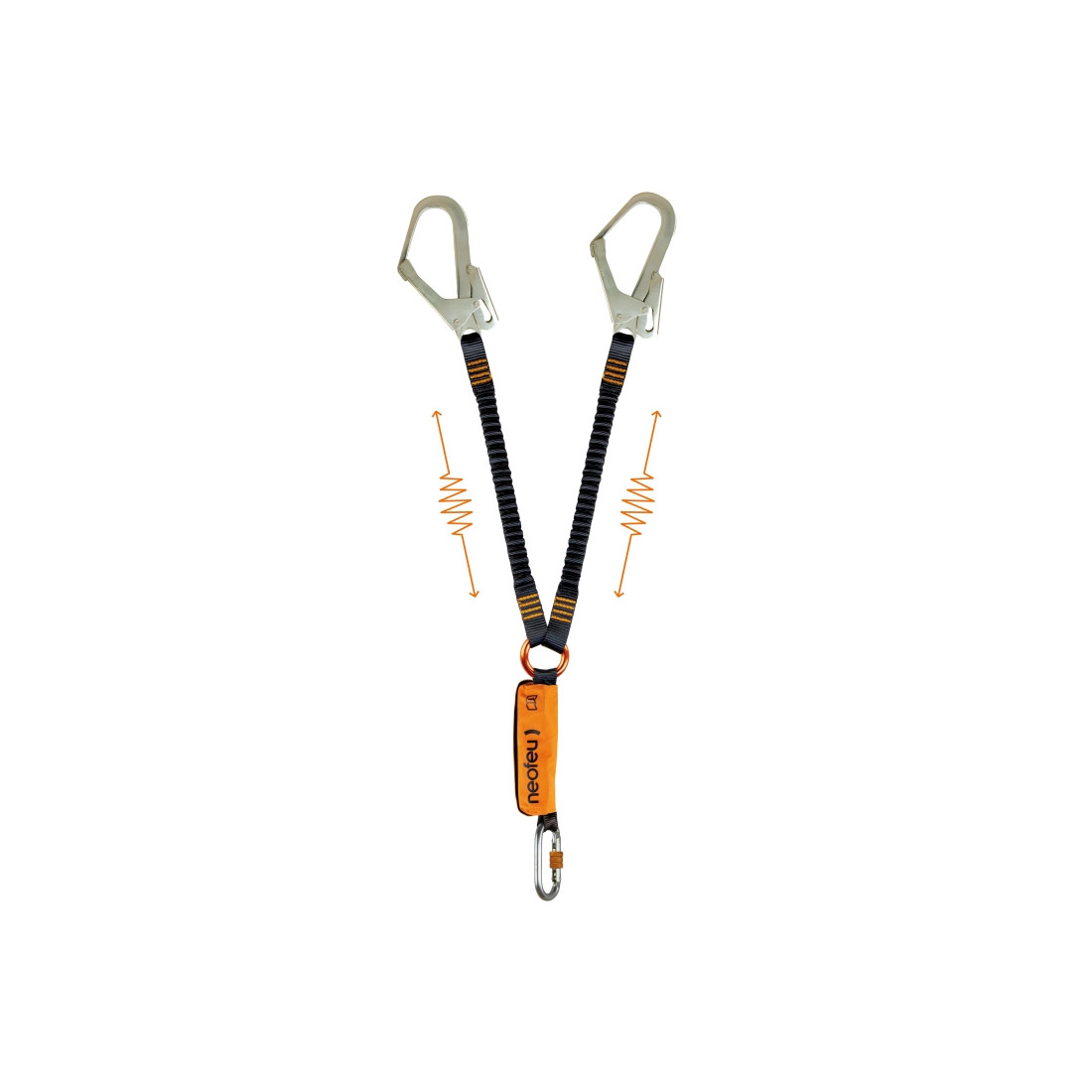 Longe double en sangle élastique avec absorbeur d'énergie (modèle Y) . Avec un mousqueton à vis acier côté absorbeur d’énergie, et un connecteur côté longe, de type: A = mousqueton acier 18 mm, B = manucroche acier 50 mm, ou C = manucroche alu 60 mm .