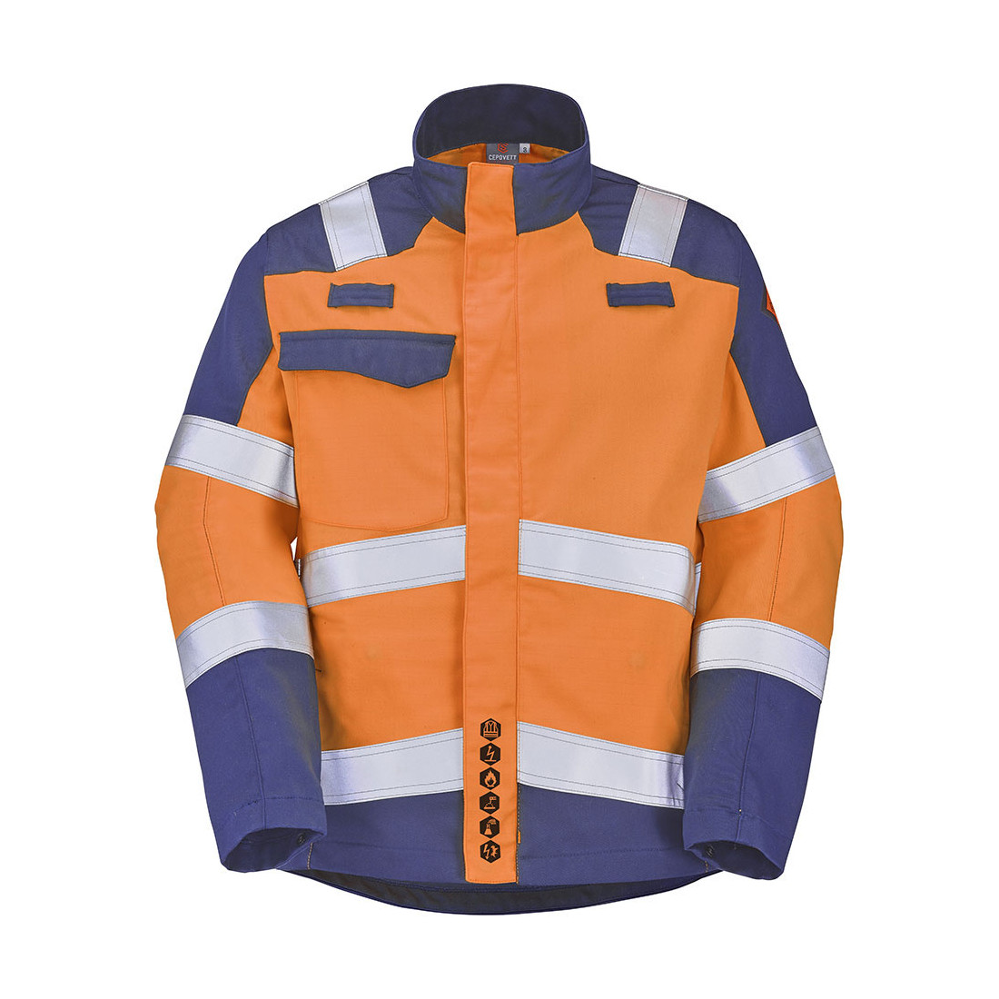 Tissu 50% polyester 49% coton 1% fibre antistatique 295 gr/m² . pictos normes visibles . Lavage industriel . Conformité : EN 20471 + A1: 2016 haute visibilité classe 2 - EN 1149-5 2018 antistatique - EN 11612 2015 : flamme A1 B1 C1 E2 F1 - EN 11611 2015 métal en fusion A1 Classe 1 - EN 13034 2005 + A1: 2009 protection chimique type PB[6] - IEC 61482-2 2018 arc électrique APC1 ATPV tissu : 7,4 cal/cm² - Tailles 0 à 6 .